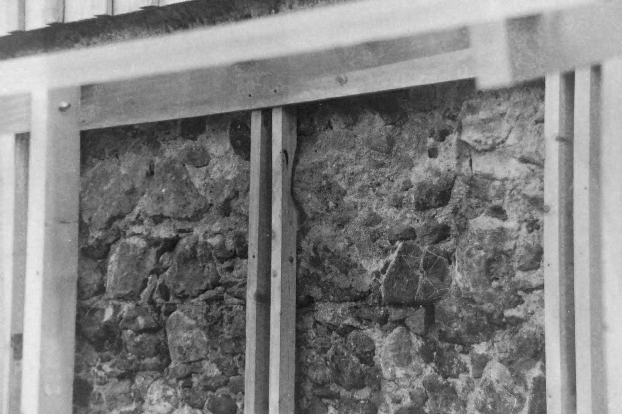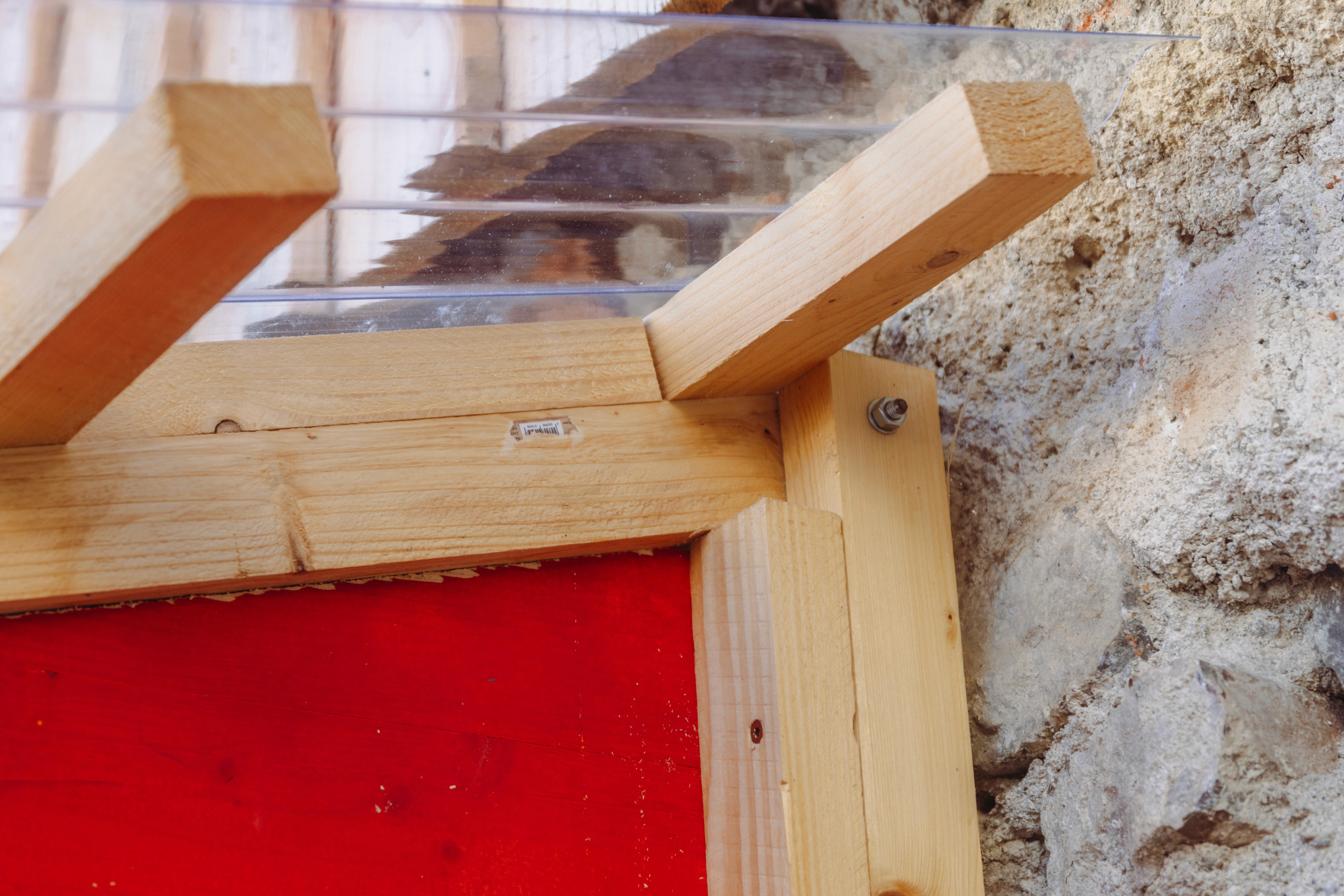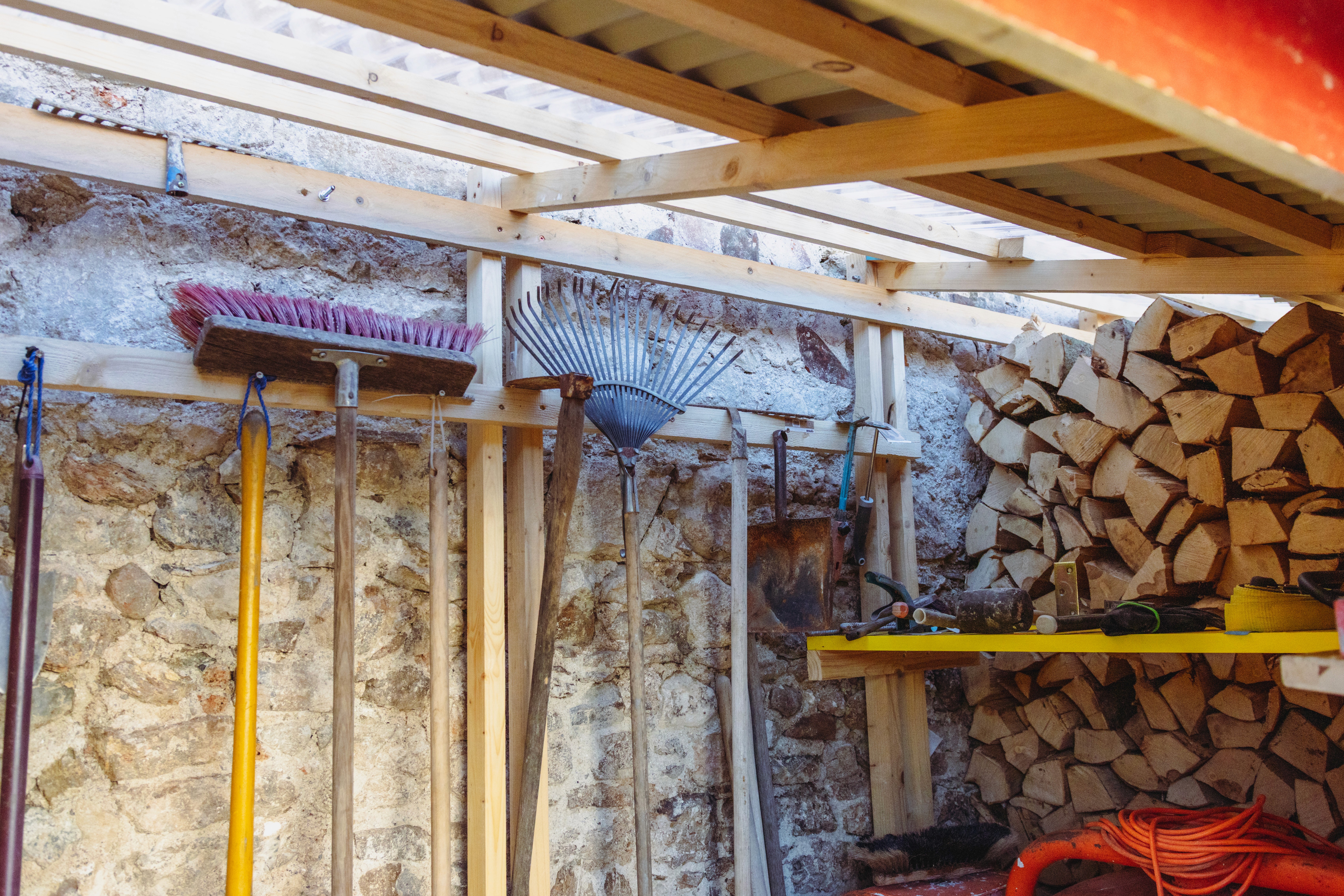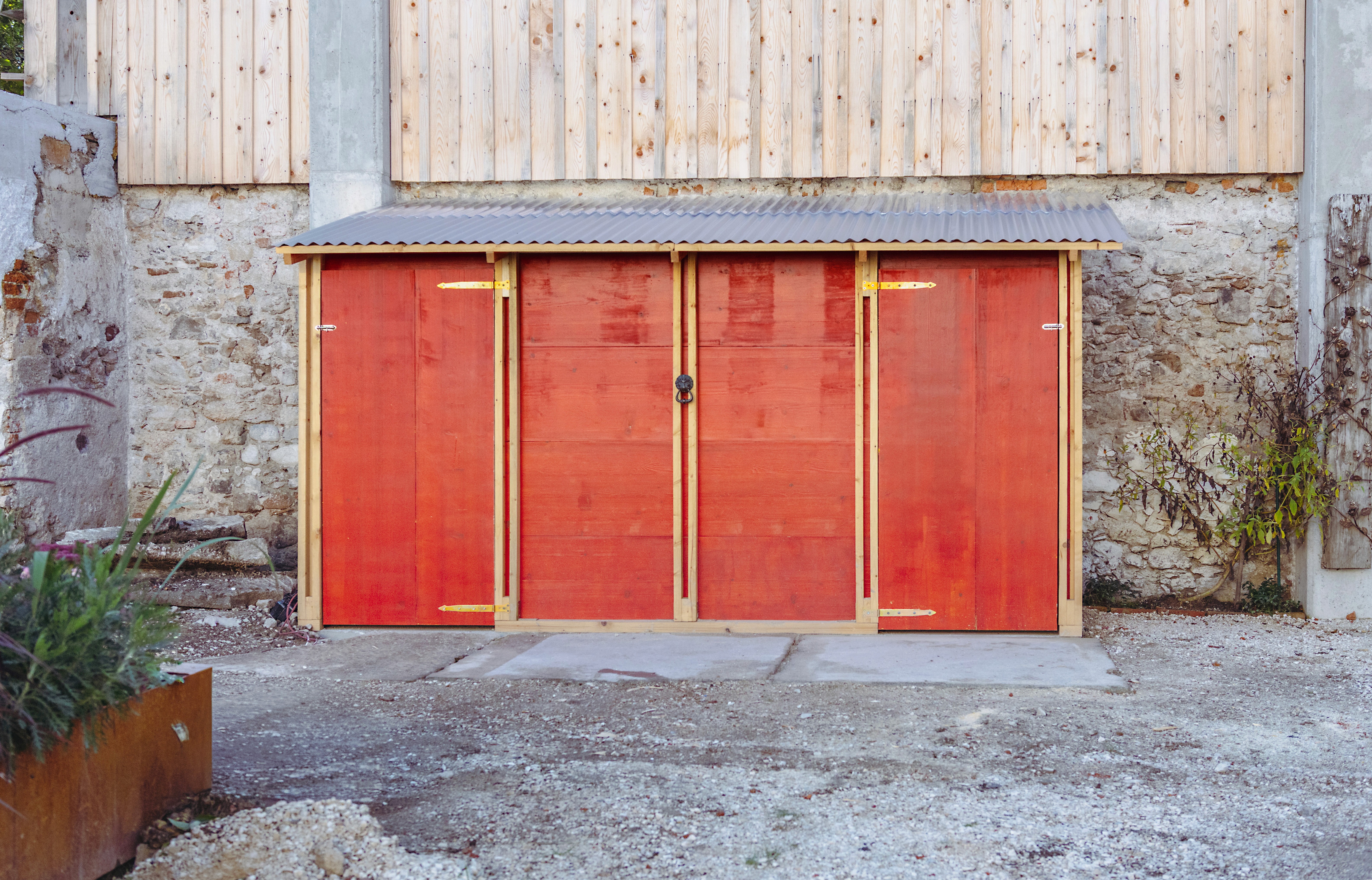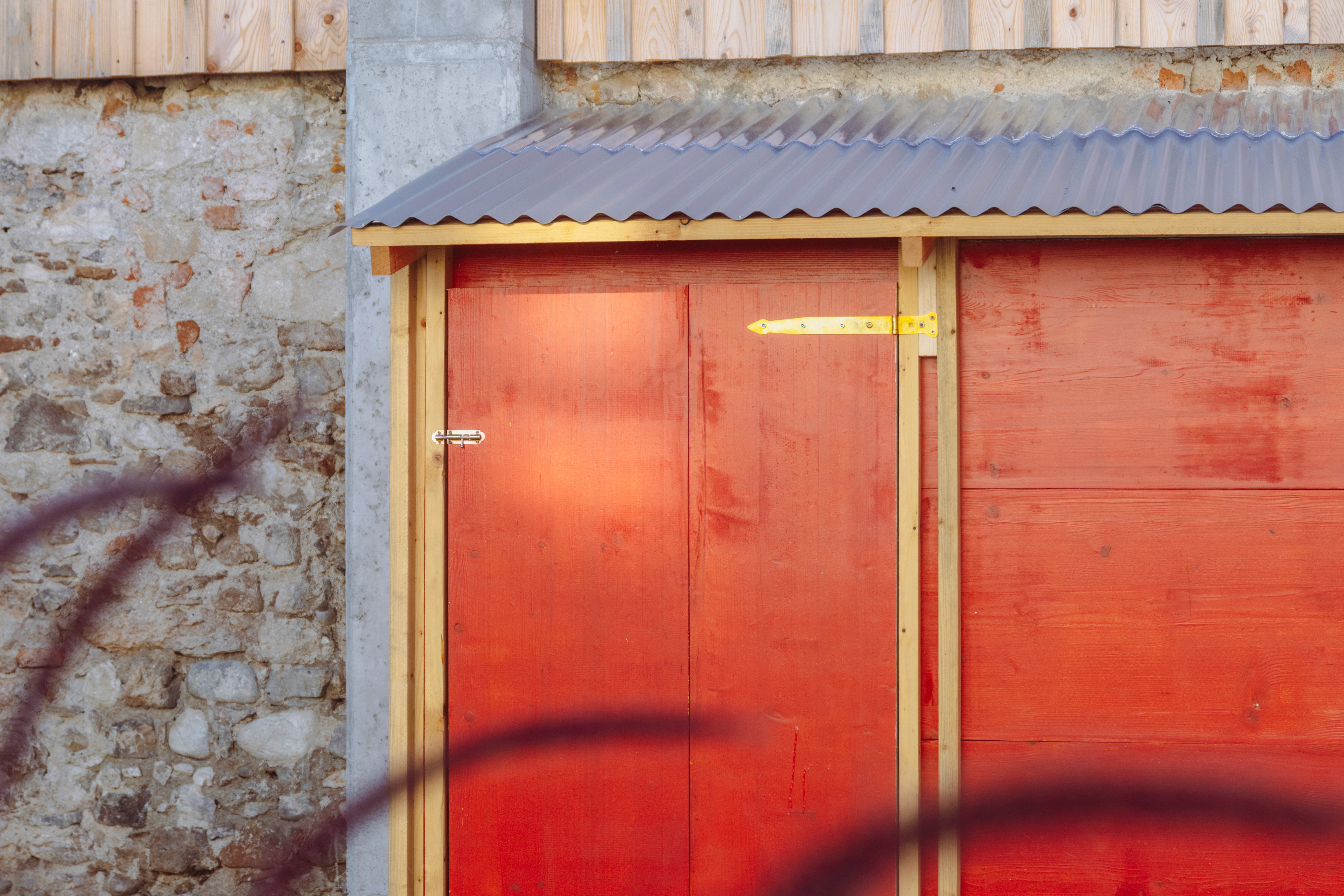 The wooden shed is positioned against the parting wall to the neighboring building, which was exposed by the demolition, the lower part consists of natural stone masonry from the 18th century. The structure is defined by a clear and visible frame construction, the dark red cladding provides a welcome accent of color in the backyard. To avoid the need for lamps and the associated electrical installation, part of the corrugated roof is made of polycarbonate. These panels also illuminate the party wall, which was left visible. Formwork panels were used as cladding, partly for cost reasons, but also to ensure stability and longevity. In front of the shed, granite stone slabs were set into the ground, salvaged from the stairs of the demolished old building.