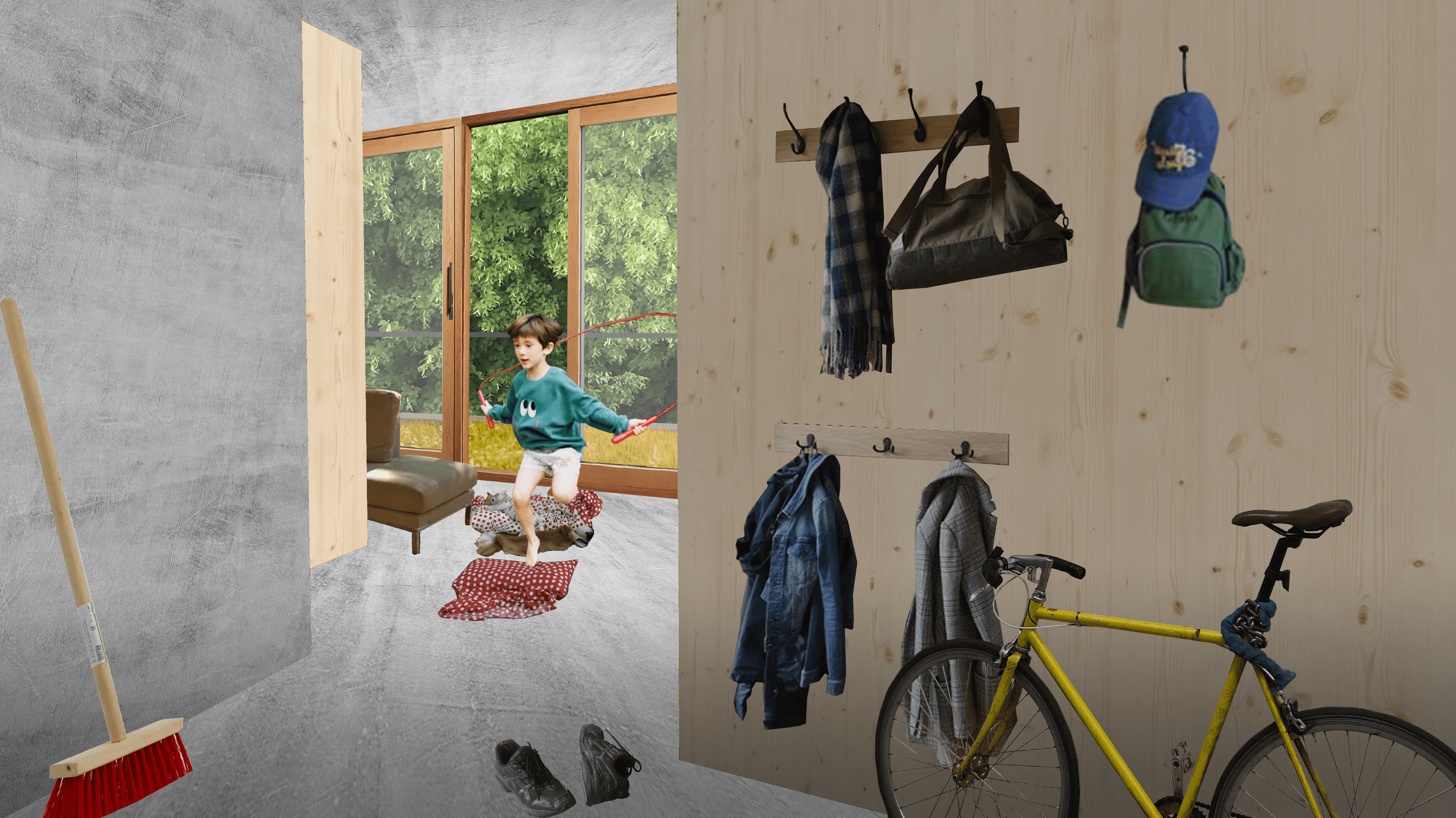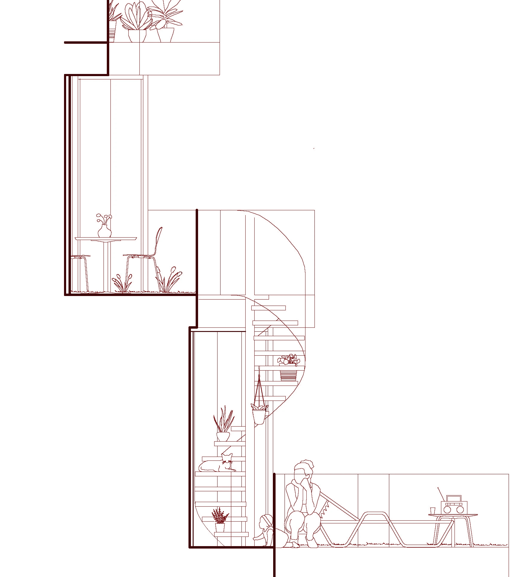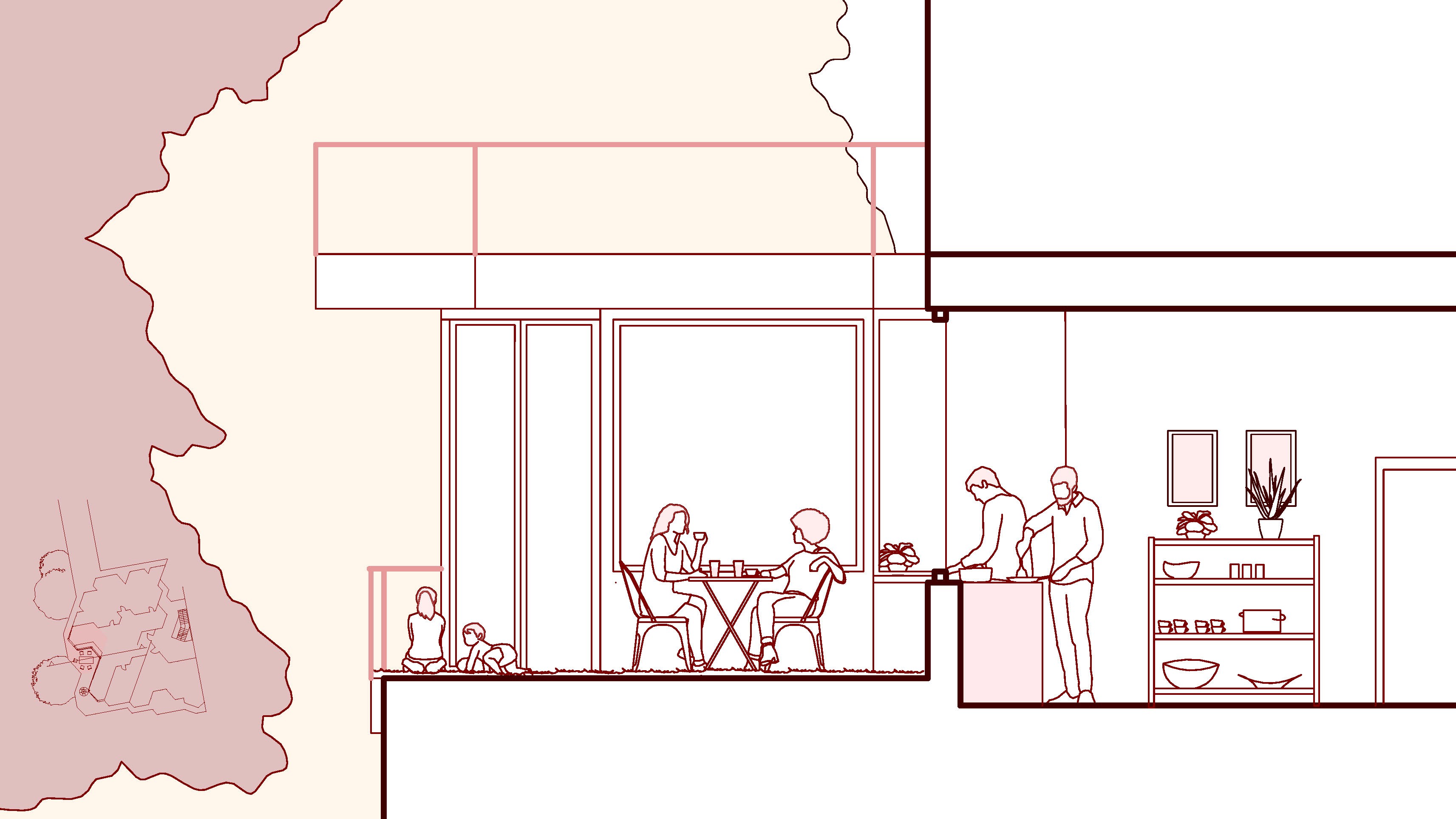 cooking is a communal activity found at the center of the apartment. large openings blend the indoor activities with the outside life. interact between one space and another. a kitchen that is both inside and outside.