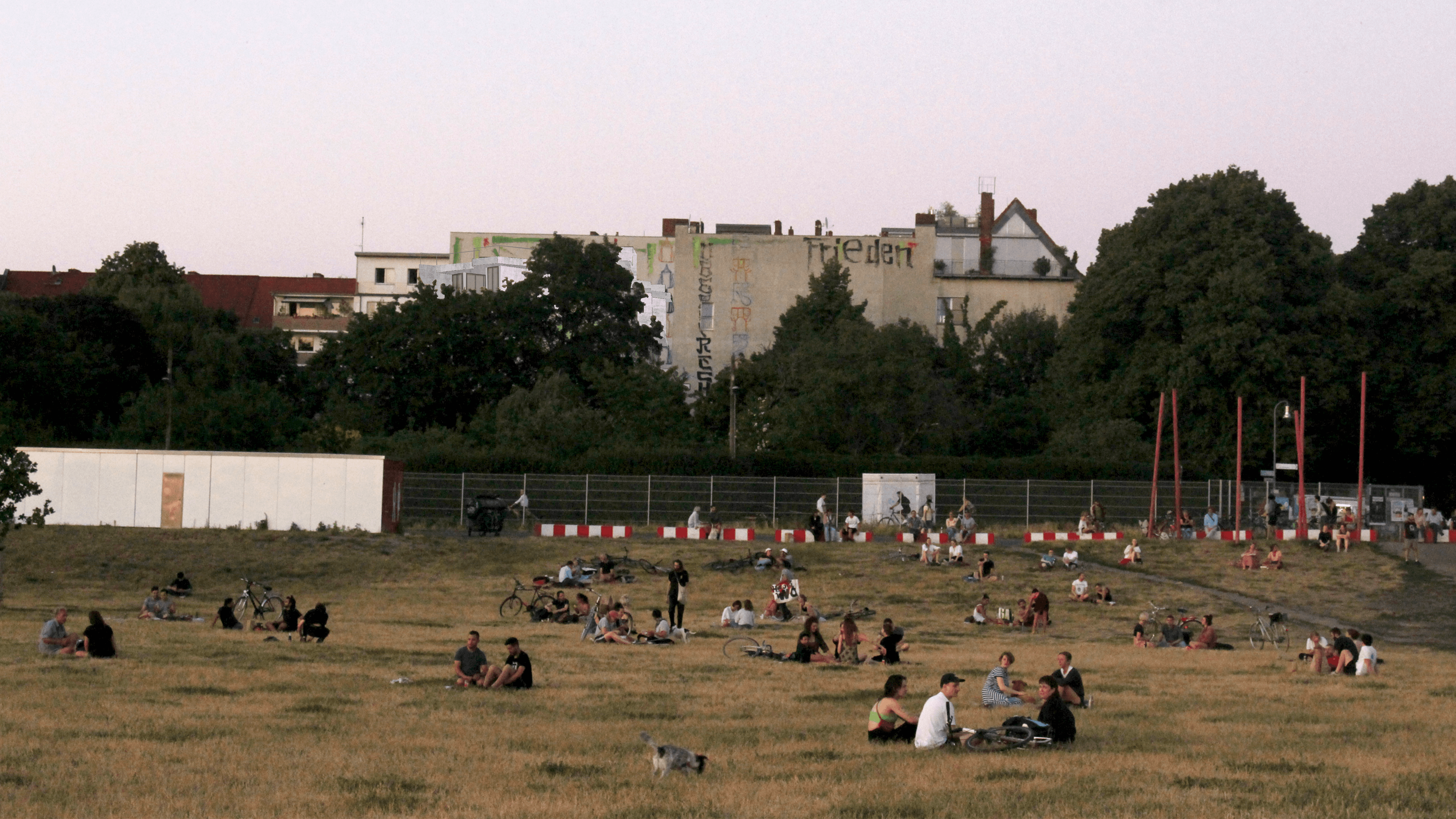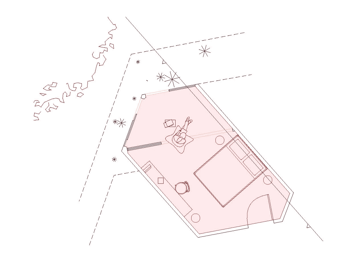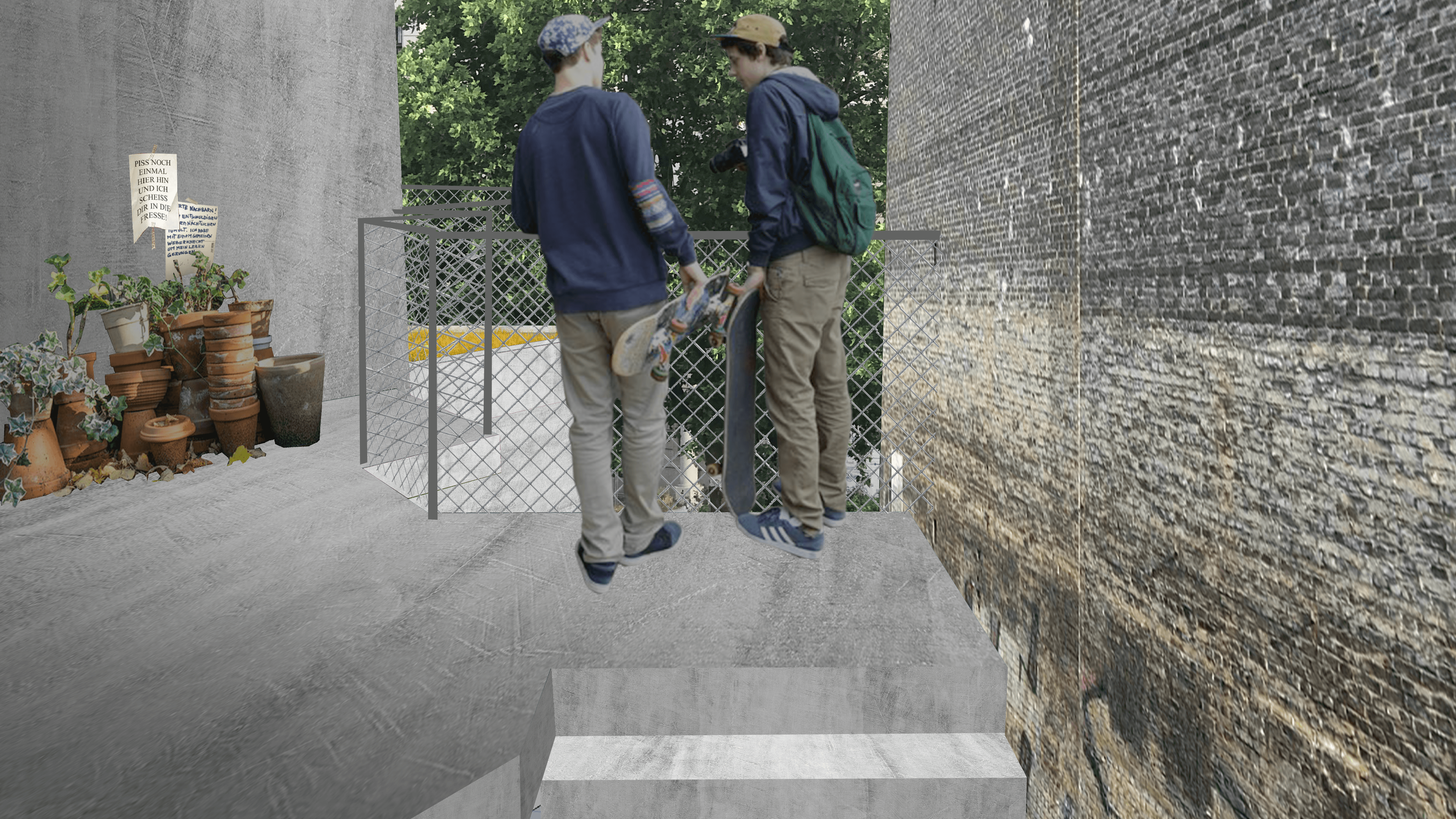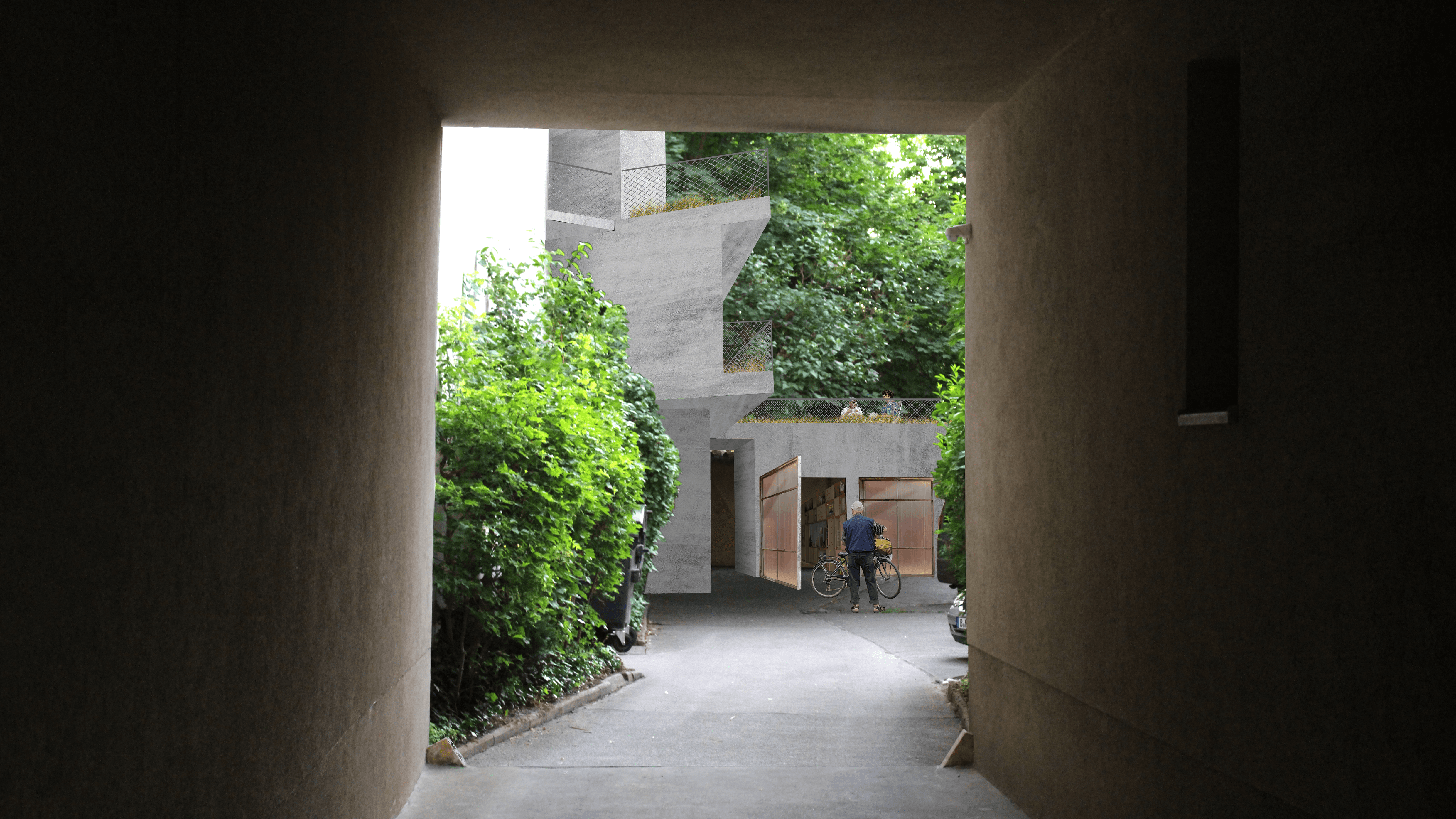 The Schillerberg is located on the border between the Schillerkiez and Tempelhofer Feld. Hidden among trees, the terraced building nestles against the Brandwand and, with its angular concrete surface and planted terraces, is reminiscent of a mountain. The open stairwell lies hidden between the new building and the wall. The ascent through the "cave" offers an alternating immersion into the dark core of the building and emergence into the greenery of the surrounding trees. The contrast between the surfaces of the existing Brandwand and the concrete of the new building intensifies the feeling of being in a cave, between rock and earth. The terraces of each floor are connected by spiral staircases. This secondary circulation enables climbing the Schillerberg from the outside. The summit of this mountain, the roof terrace, is a communal space for all the residents of the building. Like the other terraces, it is extensively planted and creates space for diverse appropriation. Due to the trees of the adjacent allotment gardens, the roof terrace is the only place in the building that offers a view of the Tempelhofer Feld.