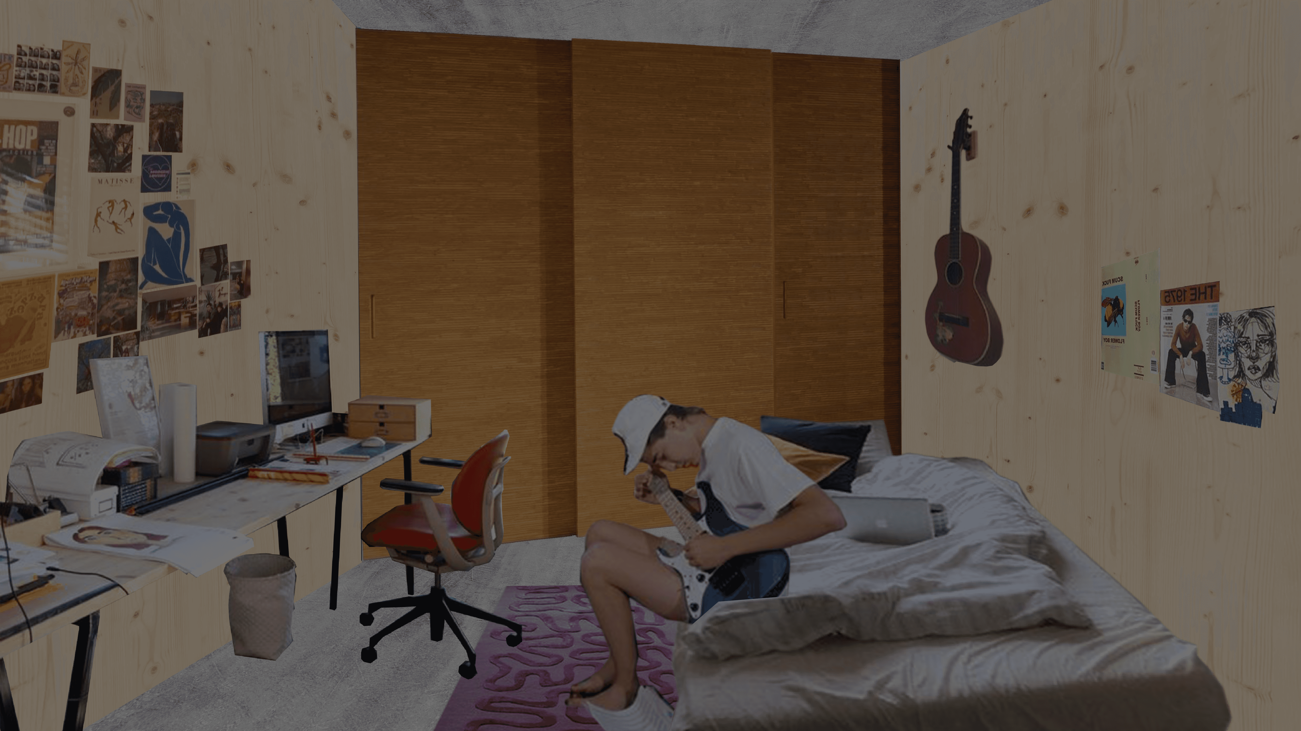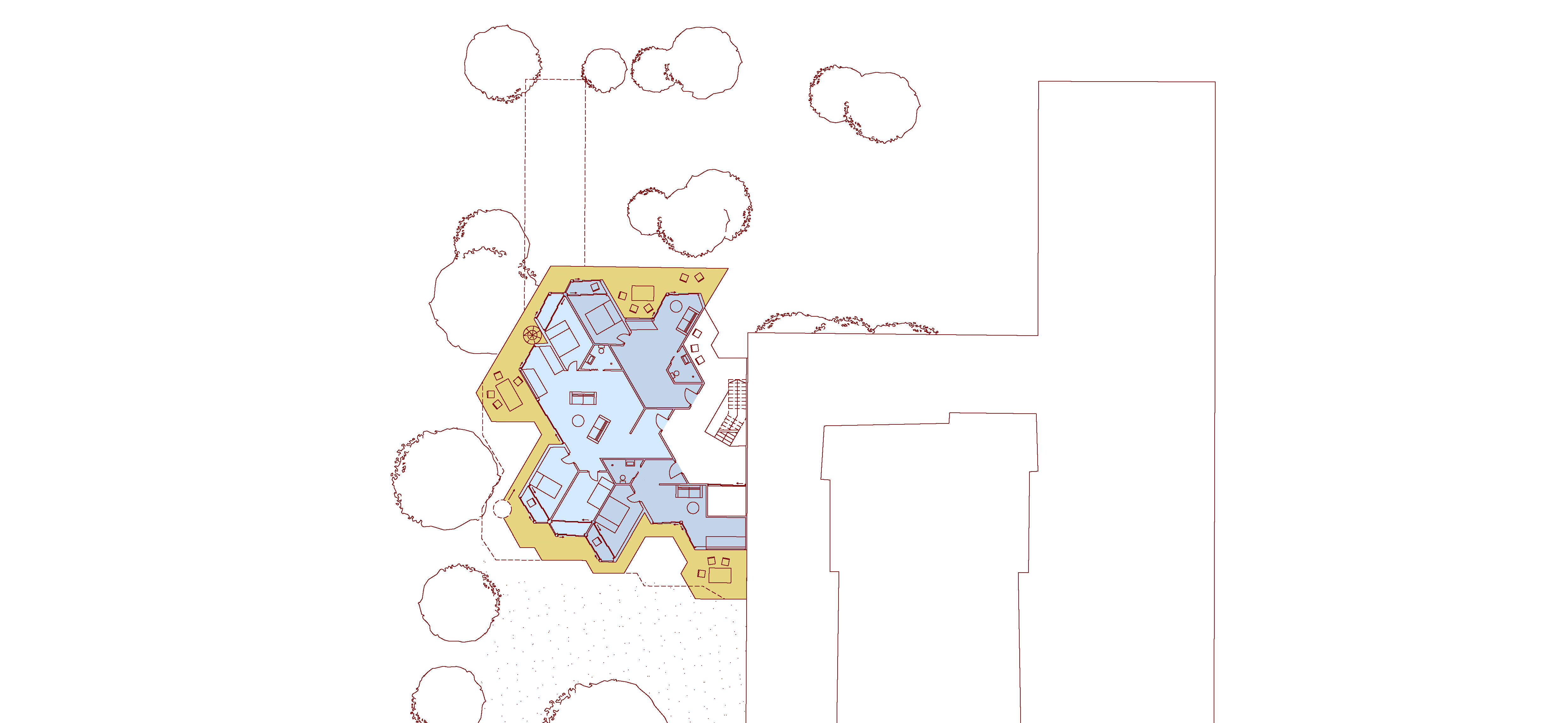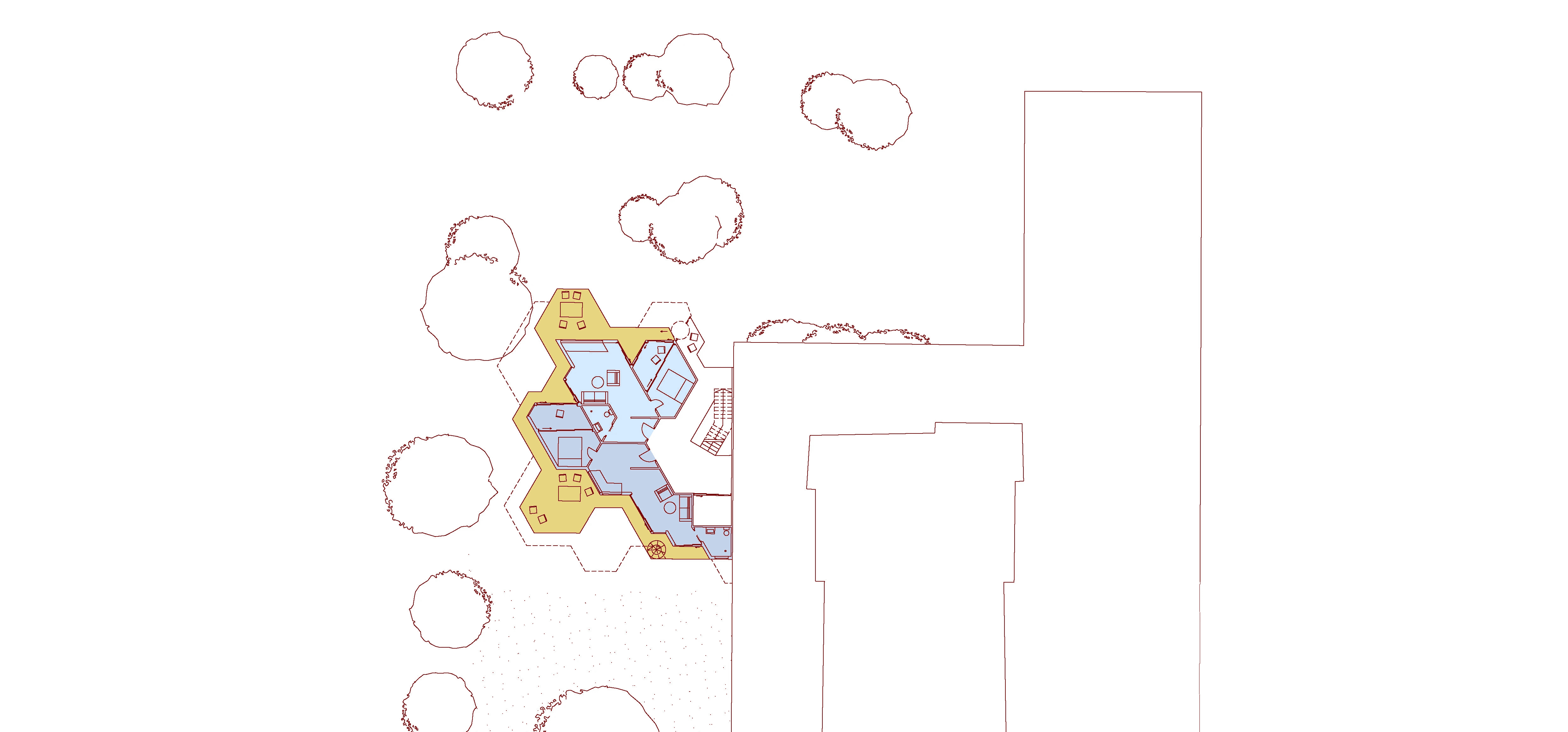 The Schillerberg is located on the border between the Schillerkiez and Tempelhofer Feld. Hidden among trees, the terraced building nestles against the Brandwand and, with its angular concrete surface and planted terraces, is reminiscent of a mountain. The open stairwell lies hidden between the new building and the wall. The ascent through the "cave" offers an alternating immersion into the dark core of the building and emergence into the greenery of the surrounding trees. The contrast between the surfaces of the existing Brandwand and the concrete of the new building intensifies the feeling of being in a cave, between rock and earth. The terraces of each floor are connected by spiral staircases. This secondary circulation enables climbing the Schillerberg from the outside. The summit of this mountain, the roof terrace, is a communal space for all the residents of the building. Like the other terraces, it is extensively planted and creates space for diverse appropriation. Due to the trees of the adjacent allotment gardens, the roof terrace is the only place in the building that offers a view of the Tempelhofer Feld.