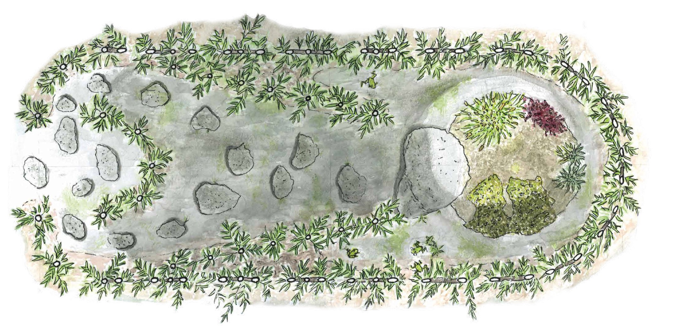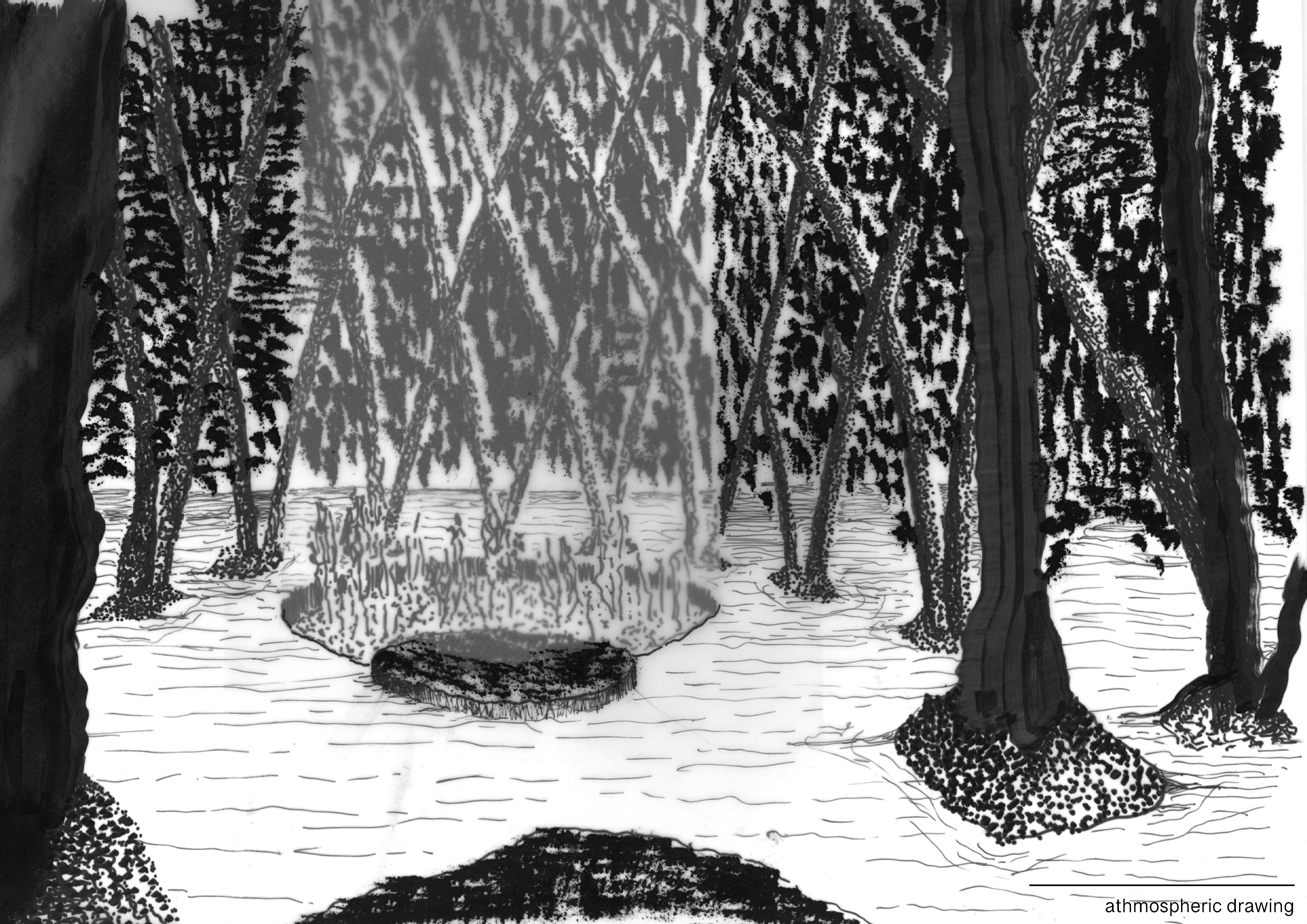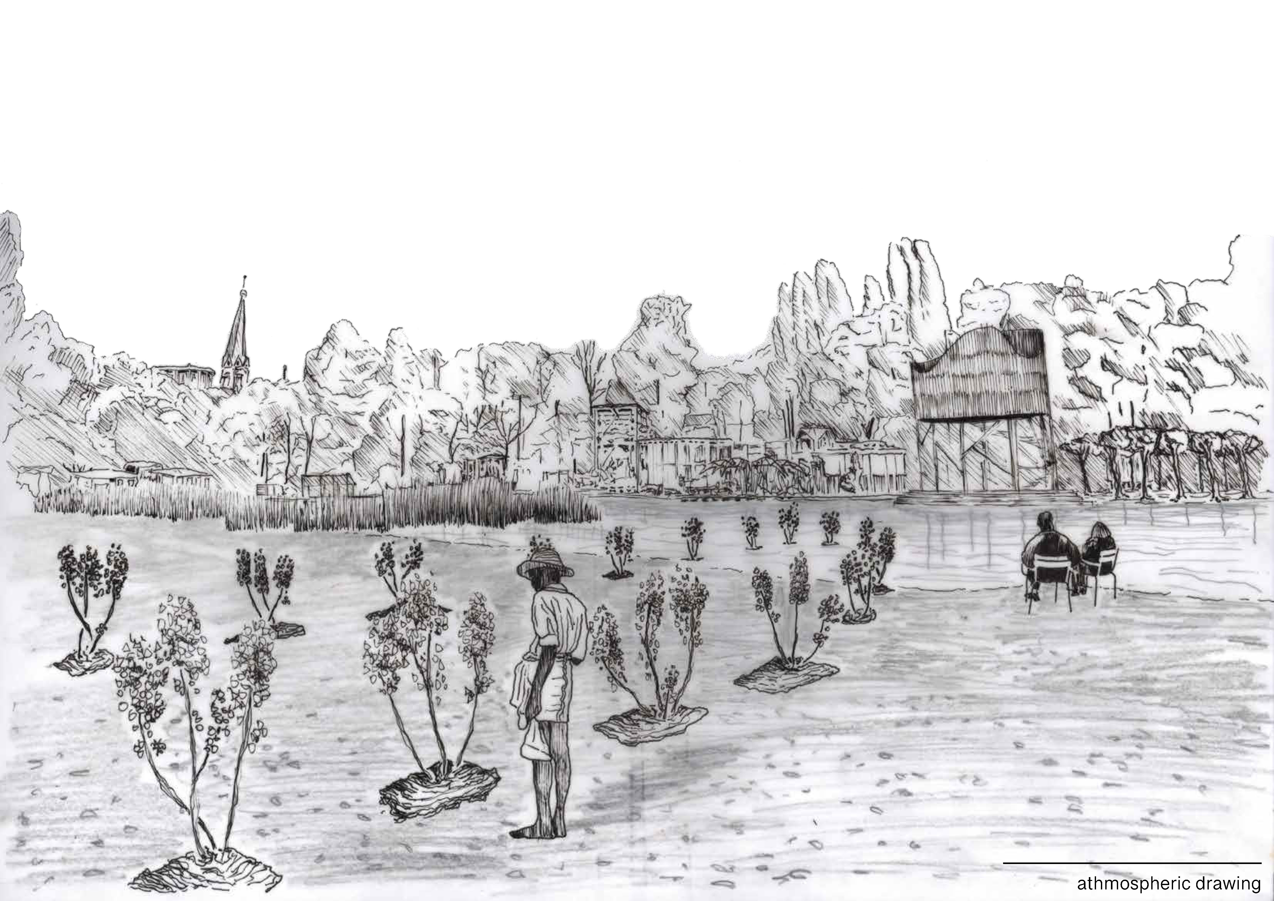 Für indigene Völker auf der ganzen Welt ist die Erde lebendig, und jede Falte in der Landschaft, jeder Hügel und jeder Felsvorsprung, jeder Berg und jeder Bach hat einen Namen und ist mit ritueller Bedeutung erfüllt. Der Boden unter dem Regenwasserbecken ist nicht weniger heilig, aber er wurde eingesperrt, abgeschnitten von Luft, Wasser und Licht. Die 20 cm Beton repräsentieren den Akt der Feindseligkeit, das Verbrechen, das begangen wurde, als das Becken versiegelt wurde. Entsiegeln bedeutet nicht, dem Boden Leben zu geben, entsiegeln bedeutet, dem Boden seine Handlungsfähigkeit zurückzugeben, ihn wieder in die Gemeinschaft und das Ökosystem zu integrieren, das Floating University ist. Die Weidenkuppel ist ein Geschenk, ein Opfer, eine Entschuldigung; sie soll schützen, bewahren und mit ihrem Zweck wachsen. Ein Tempel, eine Zusammenarbeit von menschlicher und nicht-menschlicher Natur. Ein Raum für die Menschen von Floating University, um innezuhalten, zu schauen und Zeit mit dem Boden darunter zu verbringen, aber auch ein Raum für die Flora und Fauna von Floating, sich anzueignen und zu adaptieren. Ein heiliger Ort, an dem Mensch und Natur nicht länger zwei sind, sondern eins.